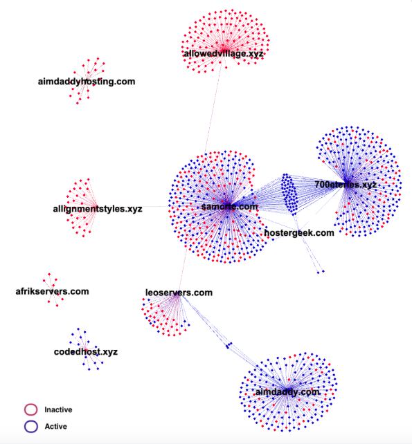 - In contrast, the name servers samcrte[.]com, aimdaddy[.]com, and 700eteries[.]xyz serve domains largely registered with NameSilo and NameCheap. These three examples are part of a group of servers active in 2022-2023. This set contains some RDGA domains, but starting in Spring 2022, an increasing percentage of the domain names have been lookalikes.