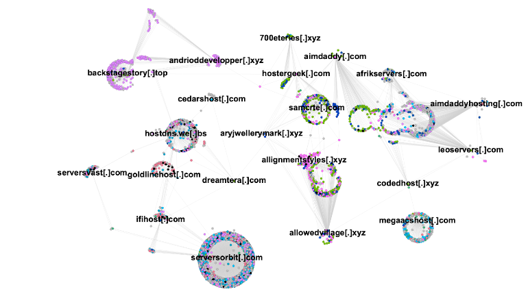 Figure 3. A retrospective view of the network of name server domains and hosted domains derived from Open Tangle campaigns from October 2022. The color of each node corresponds to the registrar of the domain. The labeled domain names all served as name servers between January 2021 and October 2022.