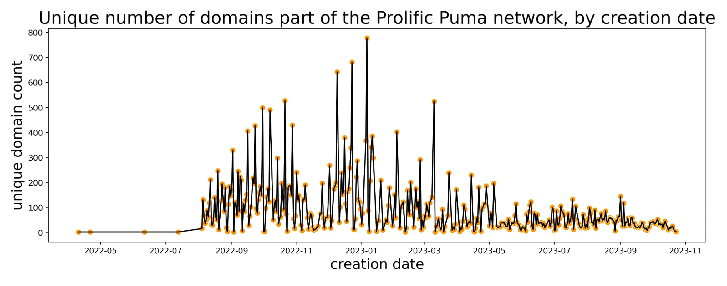 Because the connection between the Prolific Puma domains and the final landing pages is indirect, the actor has some protection against discovery. But they also fortify their ability to persist and remain unnoticed through the registration of a large number of domains. Malicious traffic gets divided across these domains at fairly low volumes. Over time, the domains may even gain a reputation as being “good” through strategic aging, a technique used by Prolific Puma that we will detail more later in this paper.
