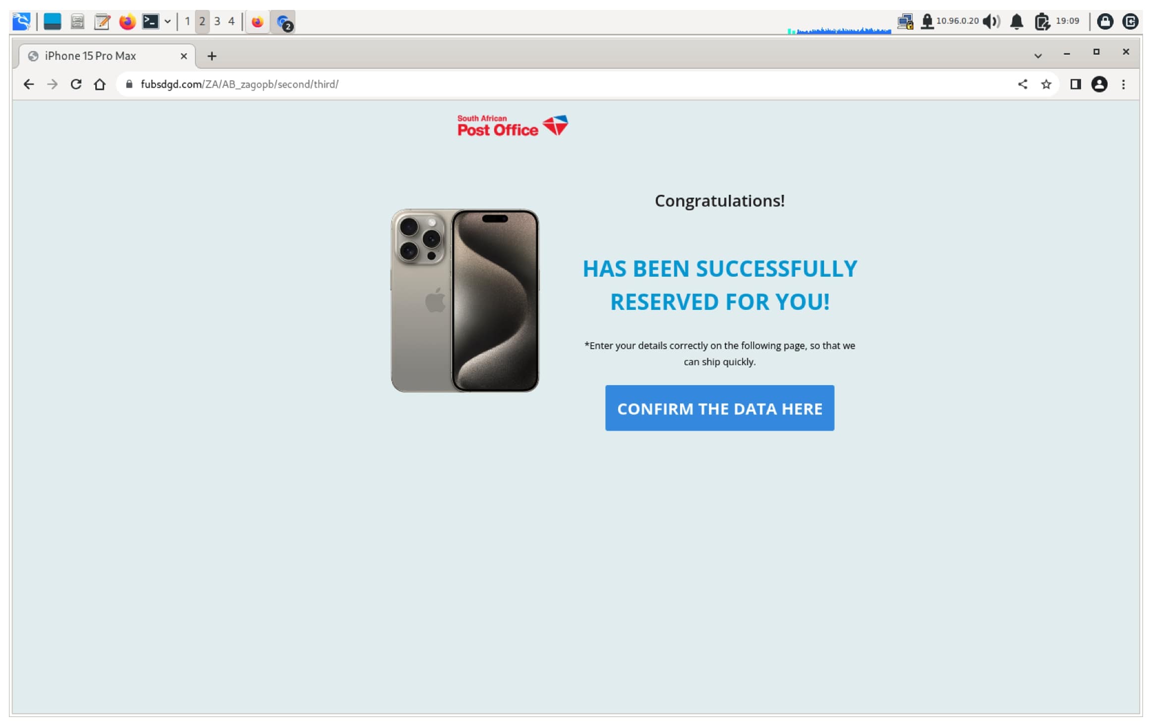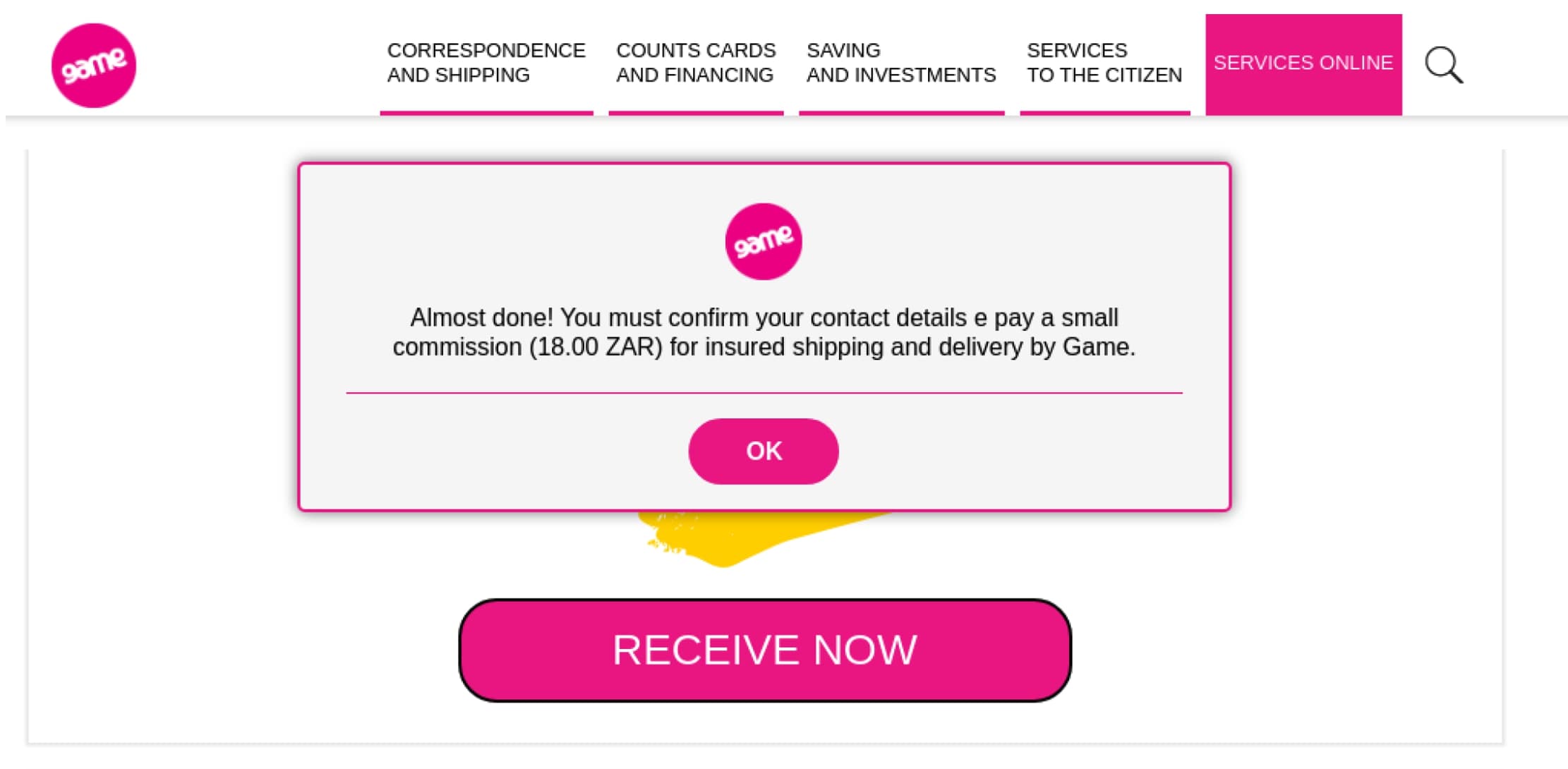 - The user is instructed to click on a link to claim their phone at https://www[.]game[.]co[.]za/2023program and enter their delivery information. The website www[.]game[.]co[.]za is a South African discount retailer using promotional drives to draw consumers.