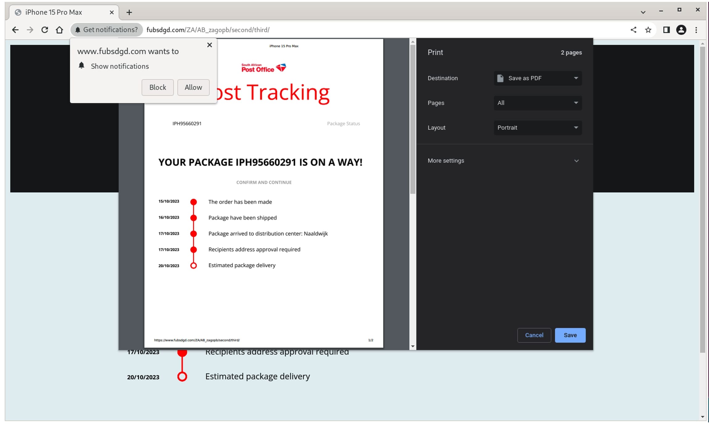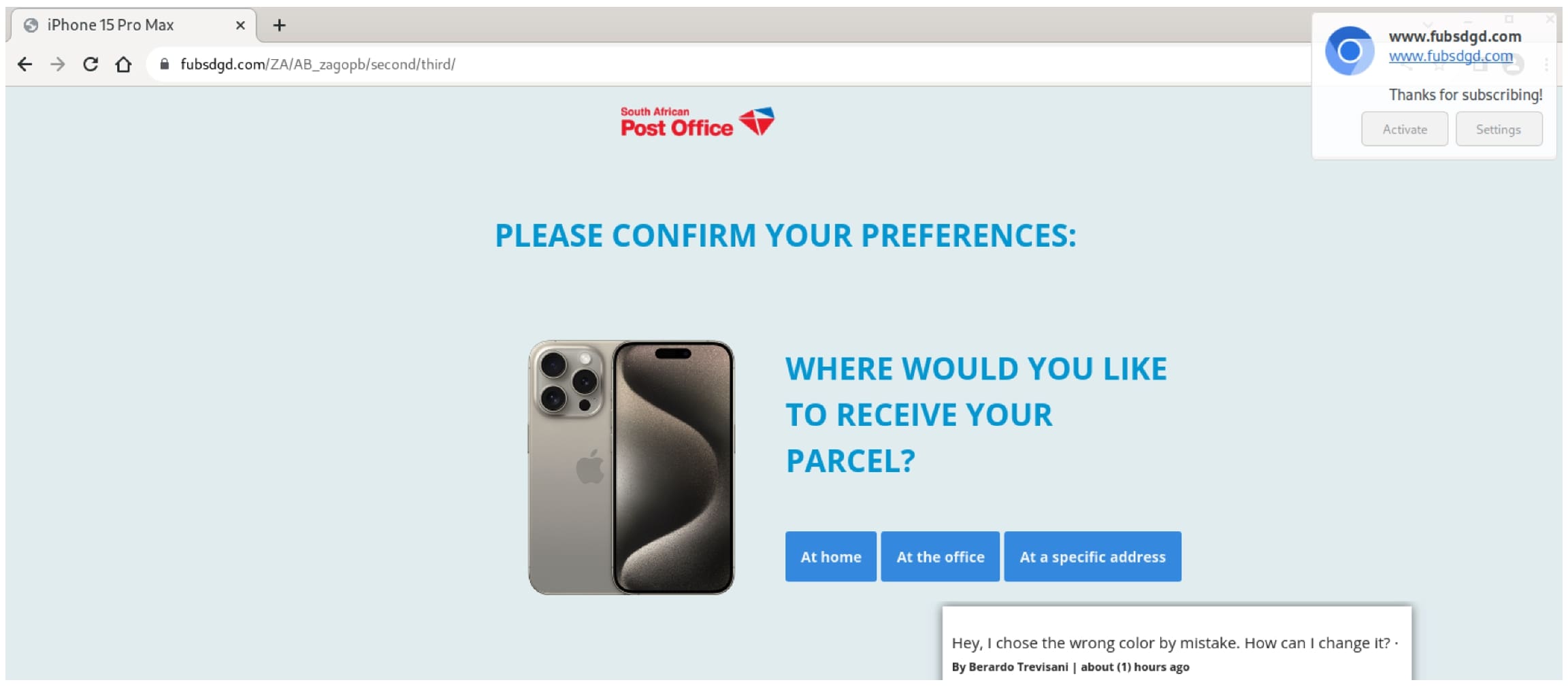 - From there, the user is presented with a page claiming to be postal tracking and prompting them to accept notifications from fubsdgd[.]com. Clicking “accept” triggers the installation of browser malware that uses the OneSignal service to push notifications. While commonly associated with ads, in our experience, browser plug-in malware is commonly used to deliver scams, phishing, and other malware, along with ads.