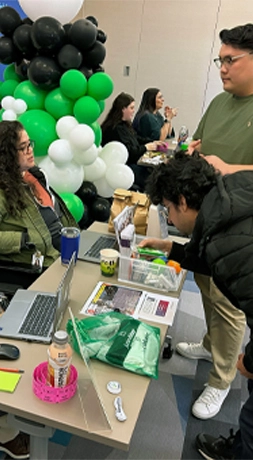 People engaging at an indoor learning fair or expo with tables, laptops, and informational materials.