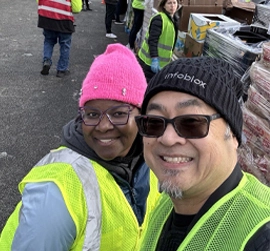 Two people in yellow safety vests smile for a selfie at an outdoor volunteer event.