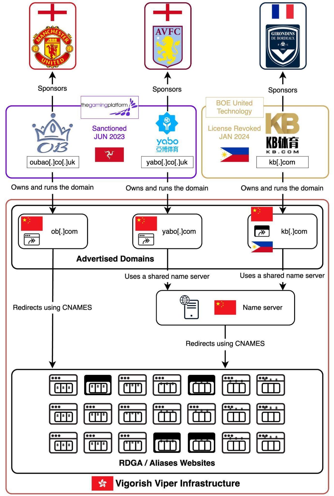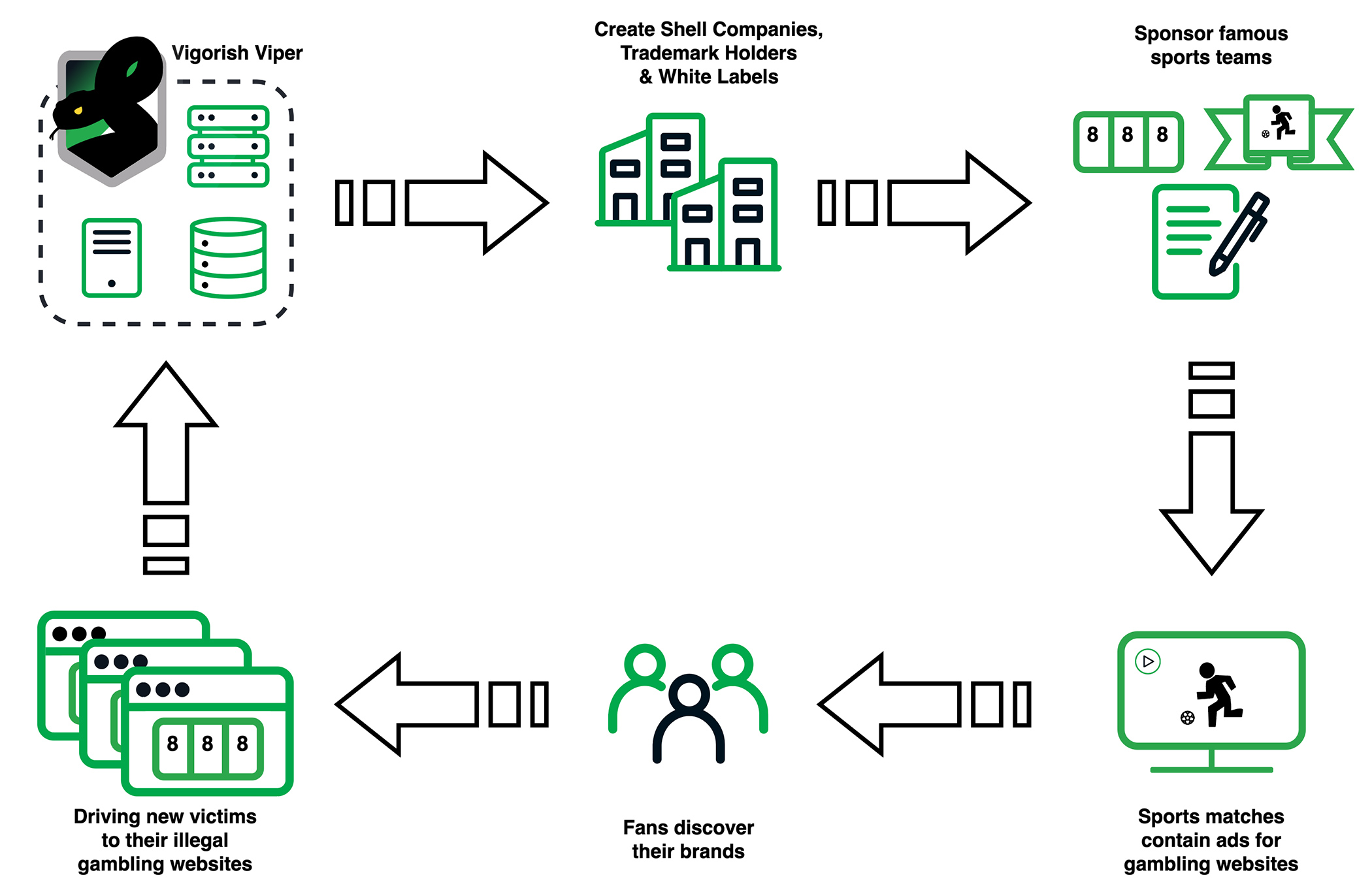 Vigorish Viper is a name derived from the gambling world’s exorbitant fees levied on unlucky bettors. The term vigorish, or vig for short, is used by organized crime syndicates to refer to these fees. Viper refers to the complex combination of TDSs and convoluted brand relationships that the actor employs to route users to content. Vigorish Viper leverages sponsorship of popular European sports teams to advertise for their illegal gambling sites, which primarily target Greater China.