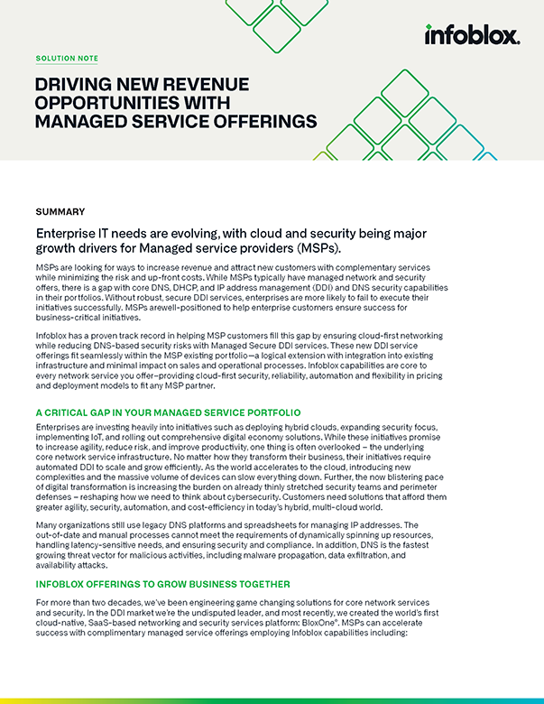 Viele MSPs bieten zwar verwaltete Netzwerk- und Sicherheitsservices an, aber häufig gibt es innerhalb ihres Angebotsportfolios eine Lücke bei den Verwaltungs- und Sicherheitsfunktionen für zentrale Netzwerkdienste wie DNS, DHCP und IP-Adressverwaltung (DDI). Infoblox hilft MSPs, diese Lücke zu schließen, indem es mit Managed Secure DDI Services die Netzwerkverfügbarkeit gewährleistet und gleichzeitig DNS-basierte Sicherheitsrisiken reduziert. Diese DDI-Serviceangebote fügen sich nahtlos in die bestehenden Portfolios von MSPs ein – mit minimalen Auswirkungen auf die Vertriebs- und operativen Abläufe.