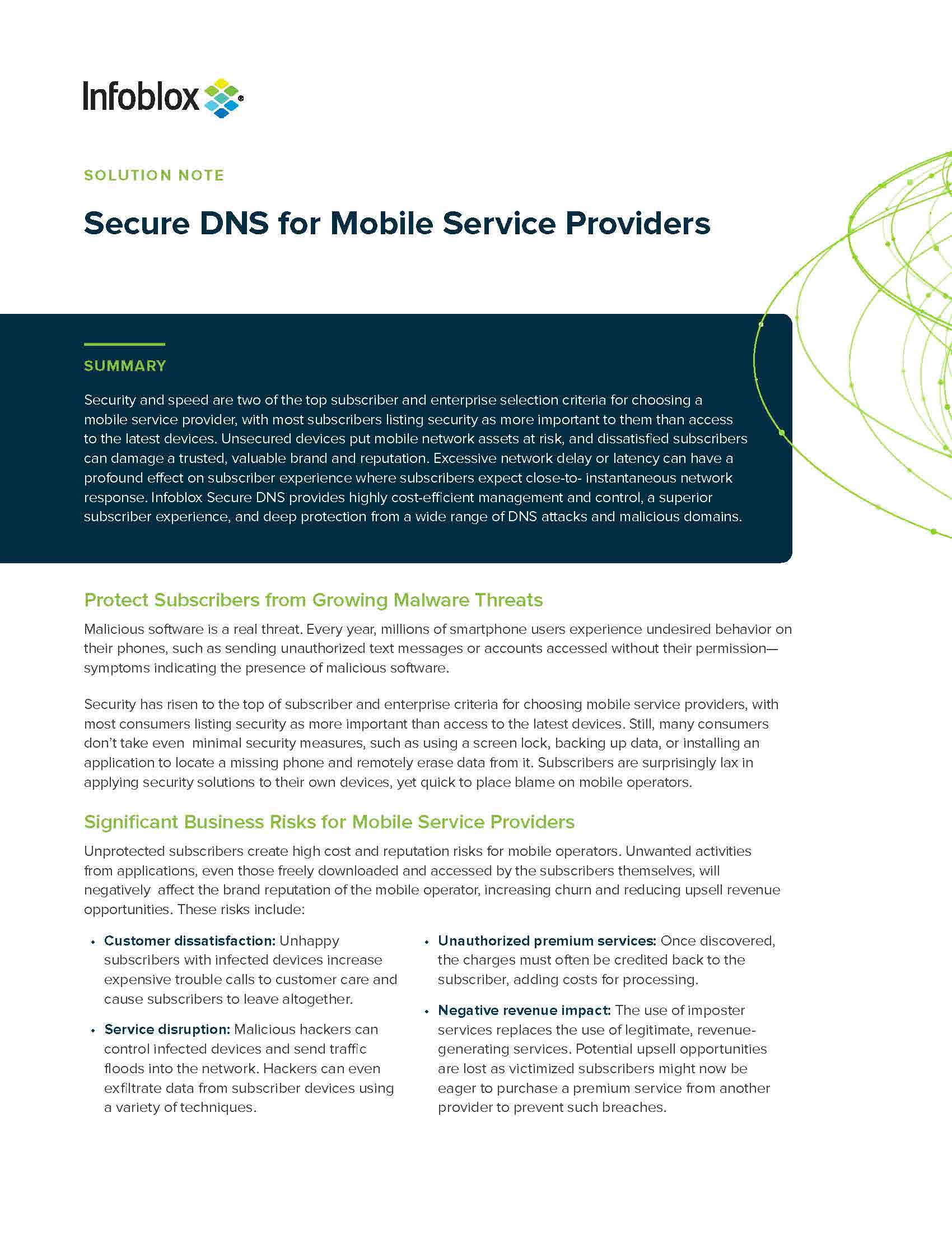 Die Lösungen von Infoblox für Service-Provider unterstützen die entscheidenden IP-Verbindungen zwischen Ihren Abonnenten und deren digitaler Welt. Unsere Cloud-First-Netzwerktechnologie bietet Sicherheit, Zuverlässigkeit, Automatisierung und extrem niedrige Latenzzeiten auf Netzbetreiberniveau – all die Fähigkeiten, die Sie benötigen, um Ihren Kunden ein besseres Erlebnis bei der ersten Verbindung zu bieten und letztlich den Übergang in die 5G-Zukunft zu erleichtern.