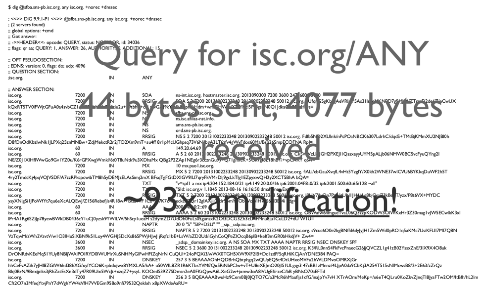 If a user makes a DNS query for “isc.org/ANY”, the query is 44 bytes long, and the response is 4077 bytes long. That is around 93 times amplification!