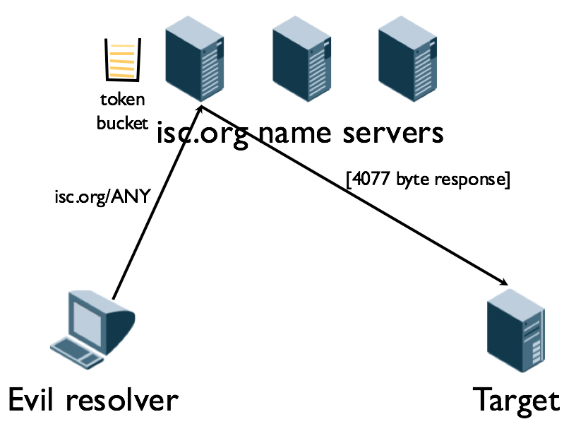 Figure 3-1: The token bucket on the authoritative isc.org name server prevents sending responses to the same client too frequently. In this example, the isc.org name servers are being leveraged in a Combination attack leveraging both a reflection attack and an amplification attack.