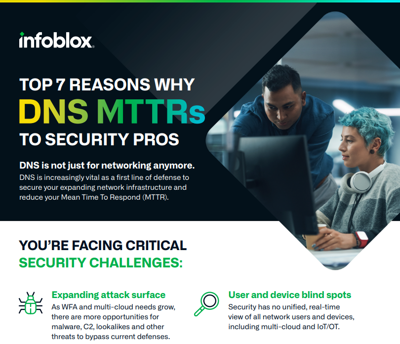 La detección y respuesta de DNS de Infoblox es la única solución que le permite ver la infraestructura de los atacantes a medida que se crea, detener las amenazas conocidas y probables antes sin comprometer el rendimiento de la red, bloquear los ataques que otras herramientas de seguridad no detectan y reducir drásticamente su tiempo medio de respuesta (MTTR).