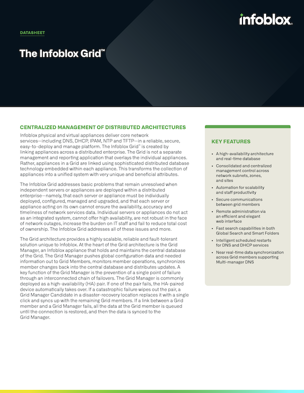 La tecnología patentada Grid technology de Infoblox proporciona una plataforma unificada para los servicios de red central. Ofrece la alta disponibilidad, seguridad y eficiencia de gestión que su empresa necesita para prosperar en el mundo híbrido y multinube actual. Basado en una sofisticada tecnología de base de datos distribuida, Grid le permite vincular fácilmente diversos dispositivos de red en un único sistema integrado que es seguro, escalable, altamente receptivo y fácil de administrar.
