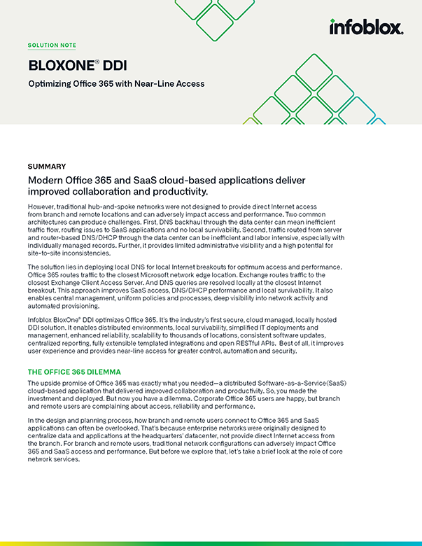 A diferencia de las redes de sucursales, BloxOne DDI conecta a los usuarios con el punto de entrada más cercano en la nube. Esto significa que Office 365 y todas las aplicaciones SaaS funcionan a la velocidad de su negocio.