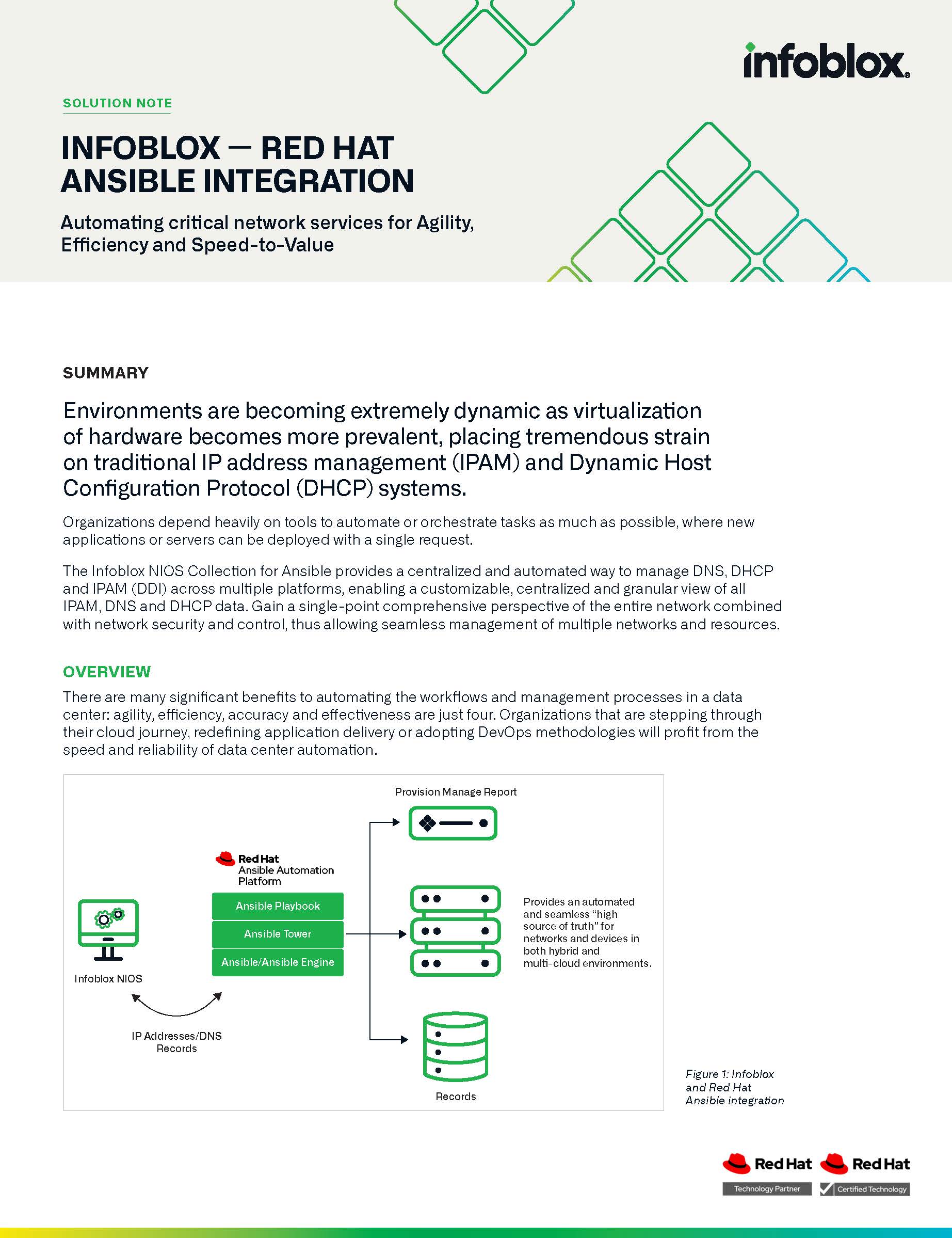 El complemento de Infoblox para tecnologías de automatización y orquestación de Ansible, OpenStack, Terraform, VMware y otros simplifica y agiliza el aprovisionamiento y desaprovisionamiento de direcciones IP a máquinas virtuales recién creadas, actualiza los registros DNS y libera direcciones IP en segundos en lugar de horas o días.