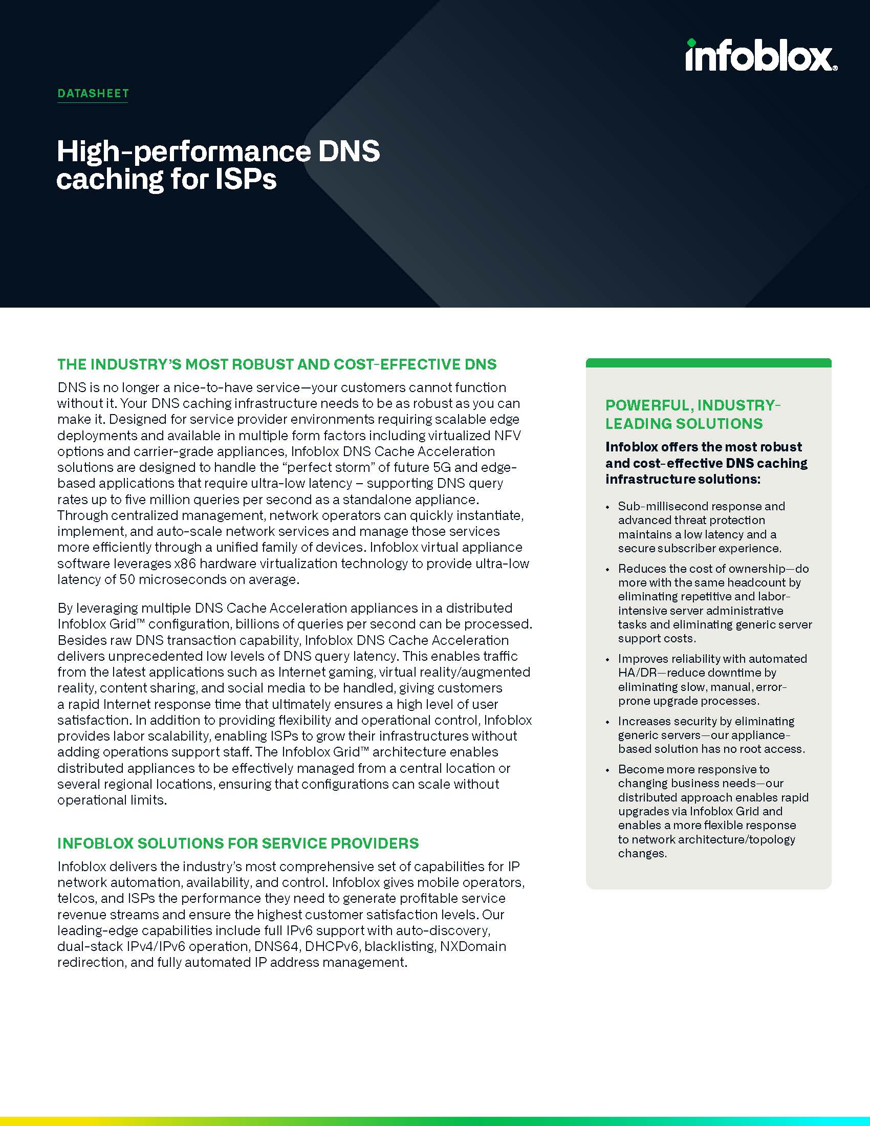 "Durante el primer despliegue a escala limitada, un Partner de Infoblox implementó la solución DNS en solo siete días para dos de las ubicaciones del proveedor de servicios. Esta implementación demostró que la solución Infoblox era fácil de implementar y estable, lo que dio a los proveedores la confianza de que la solución funcionaría para implementaciones a gran escala".