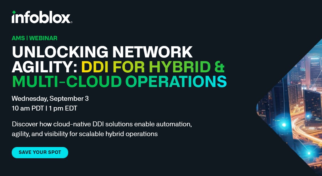 AMS – Unlocking Network Agility: DDI for Hybrid & Multi-Cloud OperationsAugust 5, 2025Deepak VermaDiscover how cloud-native DDI solutions enable automation, agility, and visibility for scalable hybrid operations. Read more