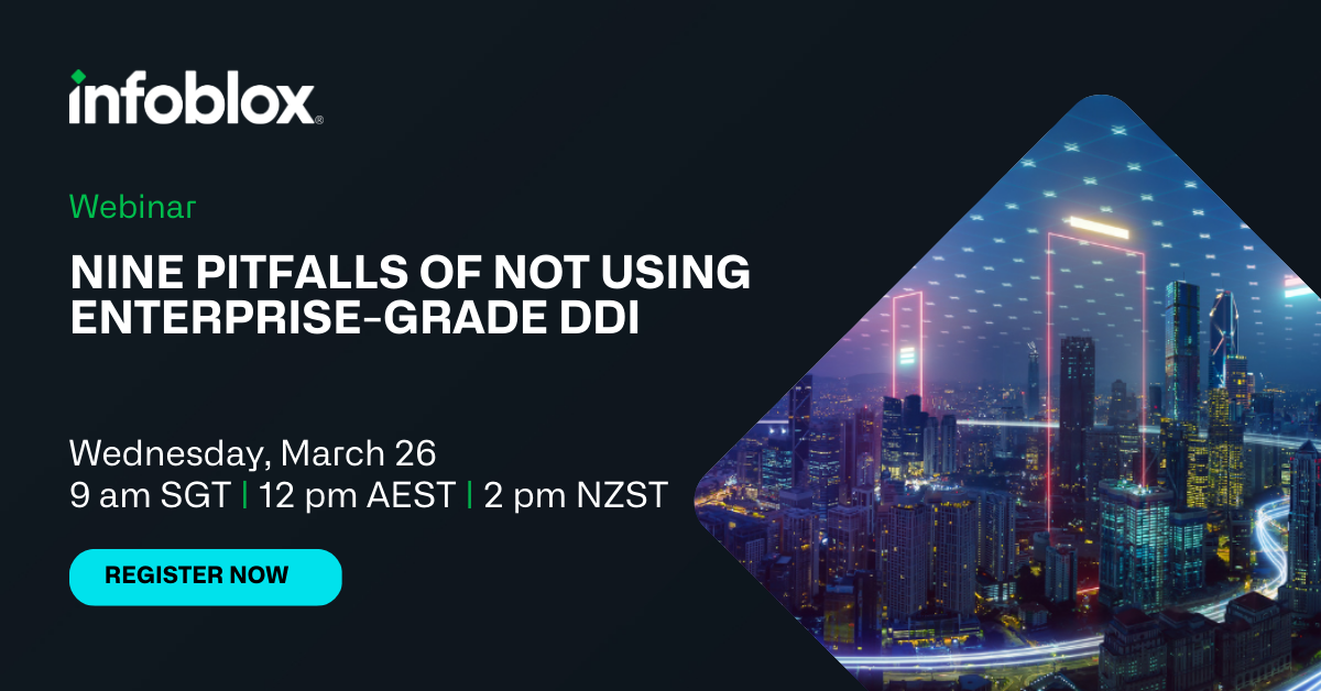 APJ – Nine Pitfalls of Not Using Enterprise-Grade DDIFebruary 28, 2025Deepak VermaJoin Infoblox and ESG experts to discover how an enterprise-grade DDI solution enhances security, automation, and scalability. Read more