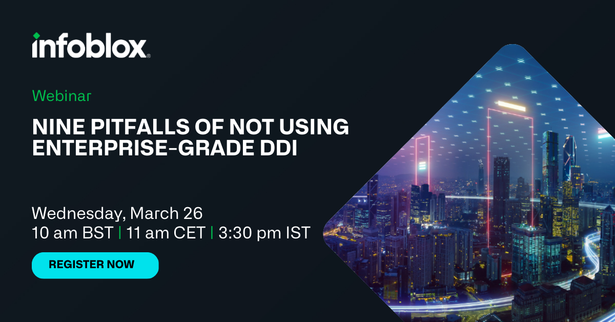 EMEA – Nine Pitfalls of Not Using Enterprise-Grade DDIFebruary 28, 2025Deepak VermaJoin Infoblox and ESG experts to discover how an enterprise-grade DDI solution enhances security, automation, and scalability. Read more