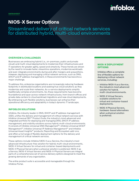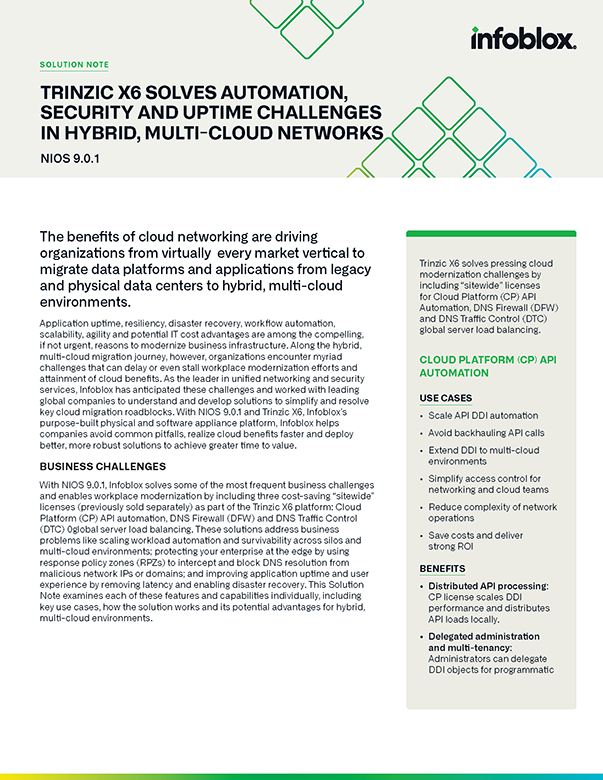 Les dispositifs physiques et logicielles Trinzic X6 d'Infoblox optimisent les services réseau essentiels avec des performances DNS et DHCP jusqu'à 50 % supérieures, une automatisation de l'API de la plateforme Cloud permettant de réaliser des économies, des licences de pare-feu DNS (RPZ) et d'équilibrage de charge DTC, ainsi qu'une gestion simplifiée pour l'entreprise hybride et multi-cloud.