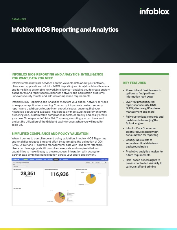 Avec la complexité croissante des réseaux et leur intégration au cloud, la visibilité devient cruciale. Grâce au moteur de rapports et de visualisation Splunk, Infoblox Reporting and Analytics vous offre une vue d’ensemble essentielle pour prendre des décisions rapides et précises, impactant fortement les performances, la sécurité et la disponibilité, même sur des infrastructures distribuées, qu’elles soient sur site, virtuelles ou dans le cloud.