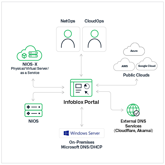 Infoblox fournit un point de contrôle centralisé basé sur le cloud pour gérer toutes les zones DNS publiques et privées dans l'entreprise hybride et multi-cloud. Déployez et gérez le DNS dans les environnements cloud (Amazon Route 53, Microsoft Azure DNS, Google Cloud DNS), les réseaux sur site (Windows Server DNS dans les environnements Microsoft ainsi que NIOS et NIOS-X) et même les services DNS externes pour les sites web et les applications hébergés par des fournisseurs SaaS tiers (Cloudflare, Akamai) — le tout à partir d'une seule API et du portail Infoblox.