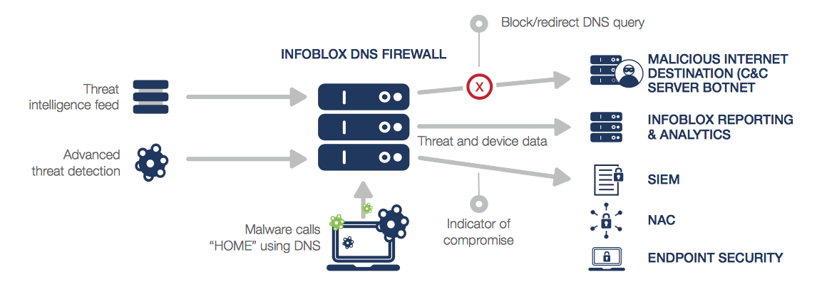 Because all malware uses DNS to communicate with its command and control (C&C) server, DNS is ideally suited to contain and control malware. Solutions, such as those form Infoblox, should focus on DNS as a point of attack and responds accordingly, to contain and control malware. Furthermore, malware prevention solutions share threat information to the broader security ecosystem via easy-to-consume ecosystem APIs, syslog, and SNMP.