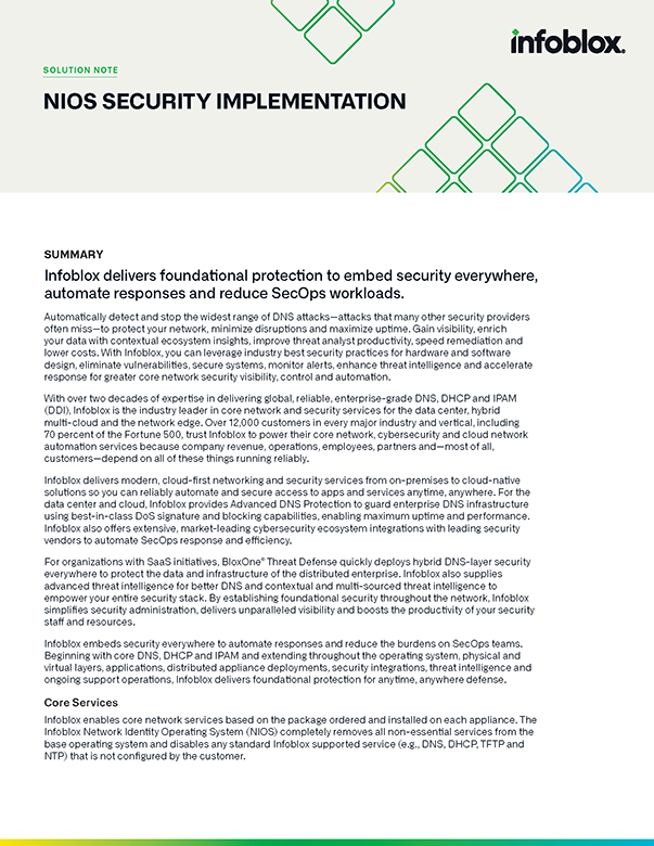 Infoblox Grid のアーキテクチャに組み込まれているセキュリティ機能により、プラットフォーム間の通信の暗号化、DDoS 攻撃からの保護、攻撃面の最小化、証明書ベースの認証、SSL 暗号化といった措置が講じられ、データのプライバシーを確保し、ネットワークデータを安全に保ちます