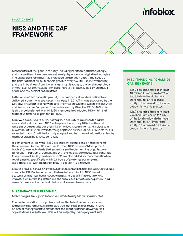 DNSは、運用準備とサイバーセキュリティコンプライアンスにおいて重要な役割を果たす基盤的なネットワーク要素です。サイバーレジリエンスには、DNSのレジリエンスとインテグリティが必要です。これにより、動的な環境全体で監査対応の資産可視性を提供し、セキュリティ防御の中核的な柱を形成します。規制が進化する中で、Infobloxはコンプライアンス要件を常に満たし、さらにそれを超えることを保証します。