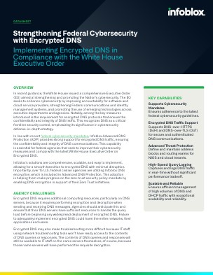 米国と EU のサイバーセキュリティ機関は、DNS クエリの盗聴や改ざんを防ぐにあたり、DNS 暗号化を支持しています。Infoblox は、オンプレミスおよびクラウド環境において必要なパフォーマンス、可視性、セキュリティを維持しつつ、DNS over HTTPS(DoH)およびDNS over TLS(DoT)ソリューションを活用して、セキュリティガイドラインおよびゼロトラスト・アーキテクチャへの準拠を支援します。