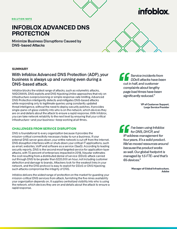 DNS is the hidden backbone of digital operations. Every website, app and user relies on it to stay connected. If external or internal DNS goes down, it can cost millions in lost revenues and lost customer trust. Infoblox DNS Infrastructure Protection (formerly Advanced DNS Protection) stops DDoS and other attacks targeting DNS servers. This NIOS software add-on keeps web apps up and running—even when DNS infrastructure is under heavy attack.