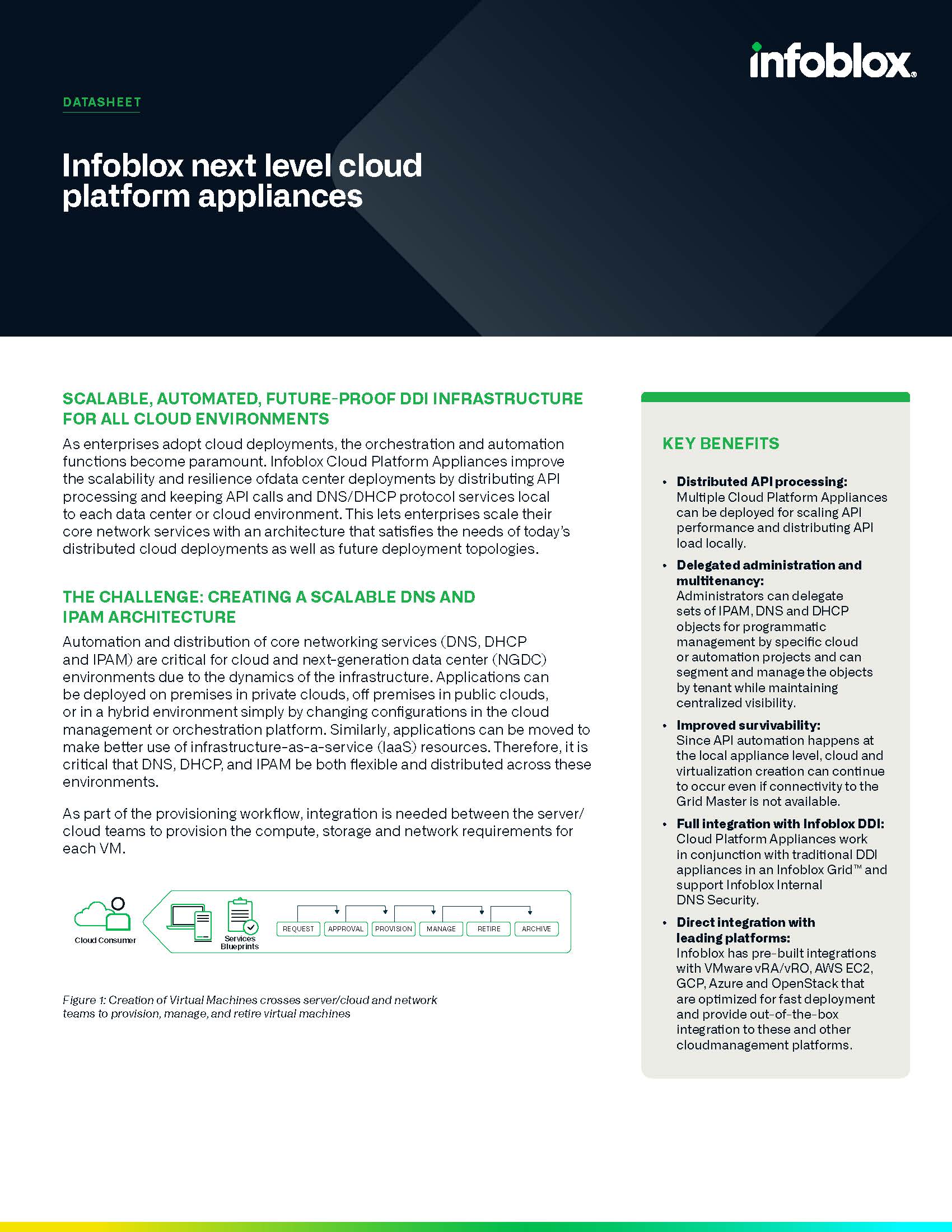 Infoblox appliances are available in a variety of options to match an organization’s specific requirements. They integrate with a broad array of automation and orchestration platforms and are simple to deploy through flexible licensing.