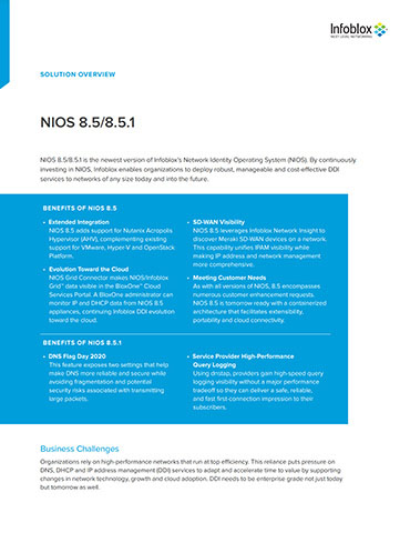 We are the industry-leading platform for DNS, DHCP and IPAM. NIOS is the only platform that offers built-in adaptors, automated discovery and out-of-the-box integration for leading virtualization and public cloud management platforms, including AWS, Microsoft Azure and Google Cloud Platform.