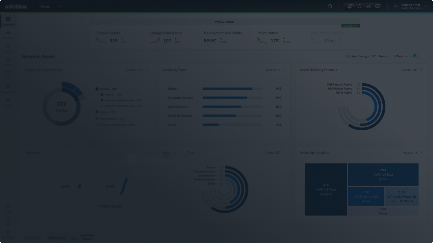 Infoblox Universal Asset Insights closes these visibility gaps by delivering trusted, cross-domain infrastructure visibility and intelligence anchored in DNS/DHCP, the authoritative control point every connection uses. Instead of relying on fragmented or inferred data, Infoblox continuously maps all connections across hybrid, multi-cloud environments and unifies them into an authoritative source of truth. With a unified view of what exists and where, teams eliminate IP conflicts, reduce attack surface exposure, uncover unmanaged cloud resources and accelerate troubleshooting with confidence.