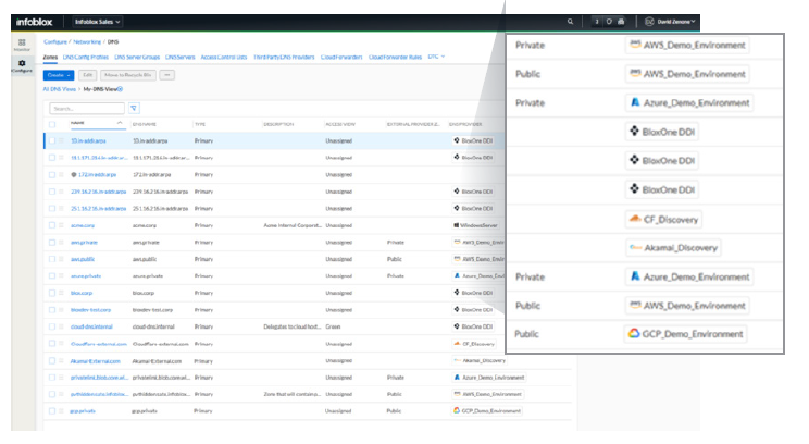 Universal DDI Management unifies management of public and private DNS Zones across the digital estate. Teams can centrally manage and provision on-premises Infoblox (NIOS/NIOS-X) and Microsoft DNS, along with Amazon Route 53, Microsoft Azure DNS and Google Cloud DNS, and even external website DNS services hosted in Cloudflare and Akamai—all from a single cloud-native interface.