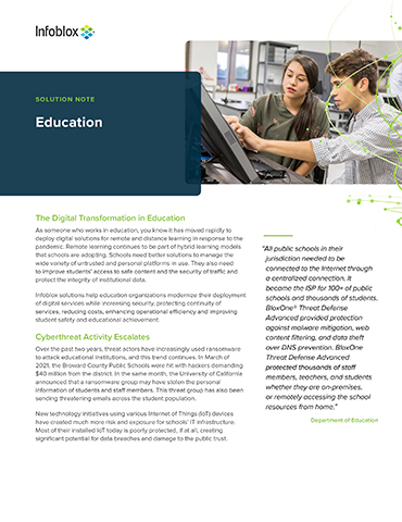 For higher education institutions like yours, the pandemic has made networking more complicated than it already was. Elements of remote and distance learning may well become permanent. Use of BYOD continues to rise—along with security risks. If that weren’t enough, your network and security teams must also find better ways to manage a diverse mix of legacy on-premises and multi-cloud network infrastructure. Infoblox solutions deliver on all counts, and then some.
