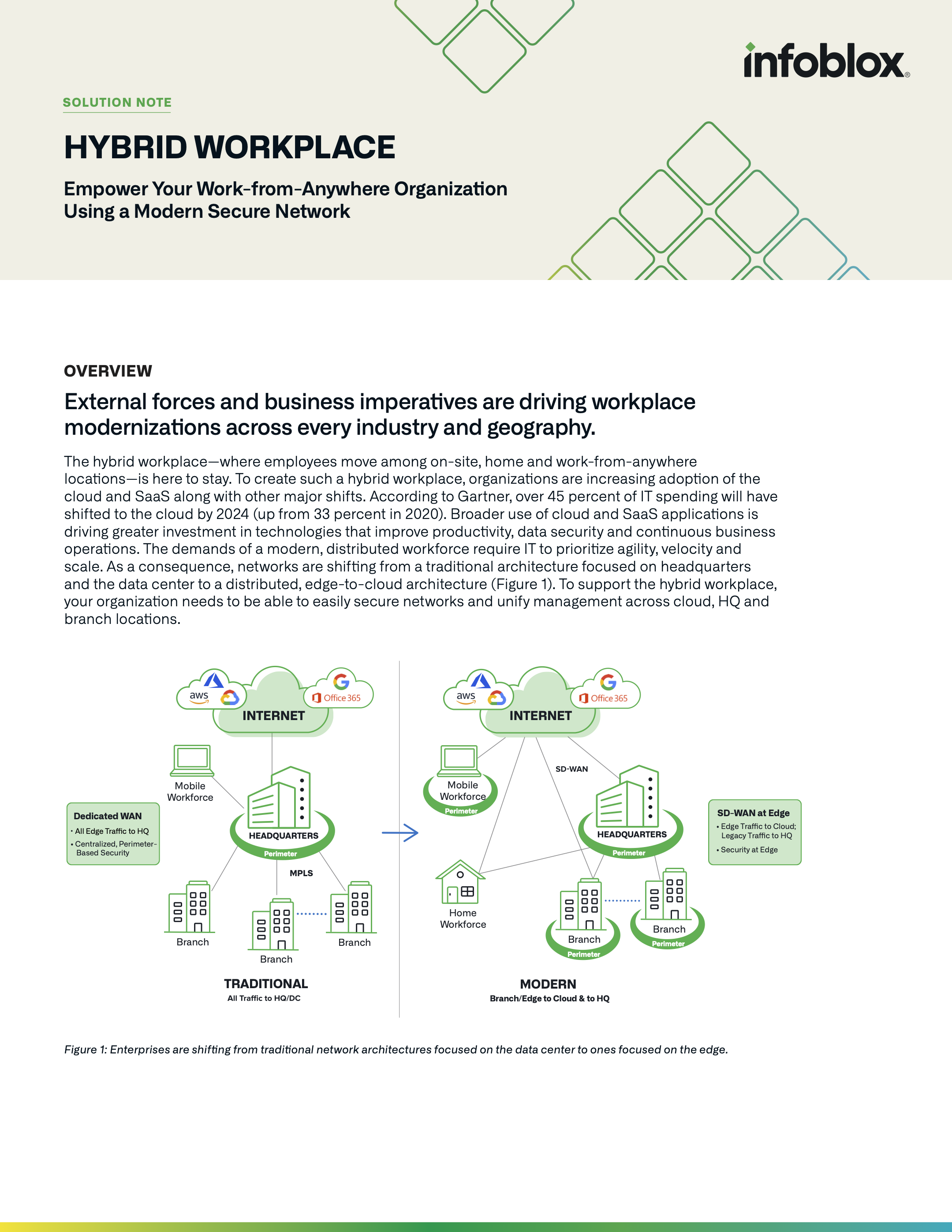 The hybrid workplace—where employees move among on-site, home and work-from-anywhere locations—is here to stay. In addition, SaaS, cloud adoption and IoT are other business imperatives that organizations are undertaking at a fast pace. To meet the requirements of workplace transformation, you must also transform your network’s capabilities. But that’s not something you can do overnight. It takes time. With Infoblox, you can securely transition to any cloud platform or application at your own pace, while preserving the functionality and investments in traditional infrastructure.
