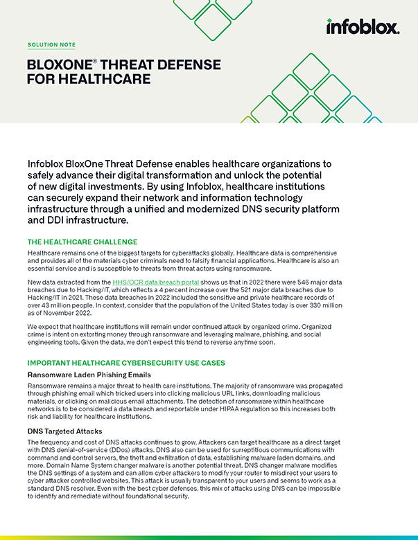 Infoblox solutions empower public healthcare organizations the world over to meet rapidly escalating demands, achieve higher levels of network security, reliability and automation and reduce capital and operating costs. In addition, we help unite existing disparate networking systems and technologies to help improve collaboration, strengthen security and achieve a higher return on IT investments.