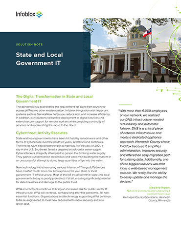 Today’s public is digitally savvy. Whether your network operates locally, at the state level or in the federal arena, you must meet rising expectations from all fronts. Consumers and employees want to interact with the government anytime from anywhere on any device. Infoblox solutions help you modernize networking for our hyperconnected, cloud-first age.